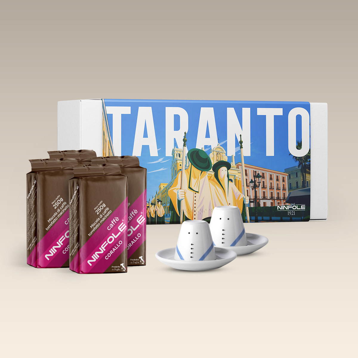 Con questo spirito nasce la collezione di tazzine ispirate agli elementi identitari del territorio. Per la prima special edition, e in occasione della Pasqua, l’antica Torrefazione tarantina presenta le tazze da caffè ispirate ai Riti della Settimana Maggiore Tarantina. La ceramica rigorosamente bianco-latte richiama alla mente la figura de “le perdune” (i perdoni): gli incappucciati che con passo lento e cadenzato (nazzicata) animano, insieme agli antichi simulacri che rappresentano la morte e passione di Cristo, le storiche processioni del Giovedì e Venerdì santo tarantino.